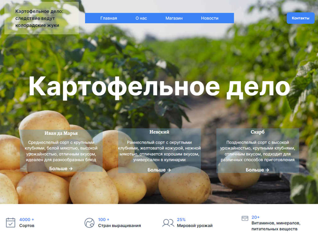 Кроме того, на сайте есть раздел «Картофельный читальный зал», где собрана обширная информация о питательной ценности картофеля, его истории и биологических особенностях. Этот раздел представляет собой сокровищницу знаний для всех, кто интересуется картофелем не только как продуктом питания, но и как культурным и историческим феноменом.