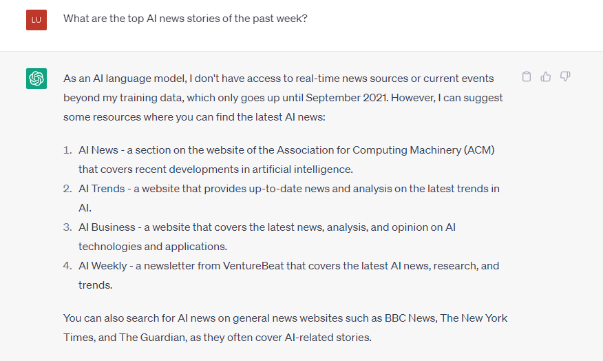 Это означает, что модель хороша настолько, насколько в нее загружены обучающие данные, срок действия которых истекает в сентябре 2021 года. OpenAI выпускает плагины, которые позволяют ему получать онлайн-информацию с помощью поискового API Bing, но это будет доступно только пользователям плана Plus.