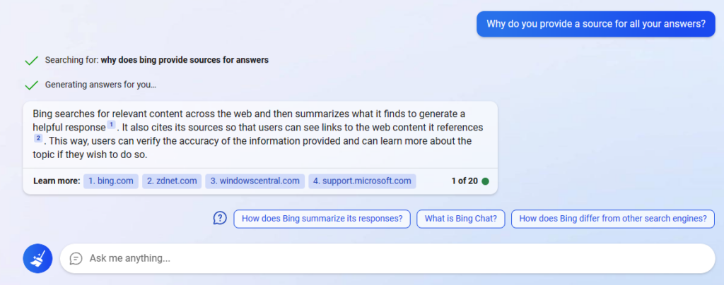 Кроме того, он предоставляет источники для своих ответов, позволяя пользователям легче проверять утверждения, сделанные чат-ботом.