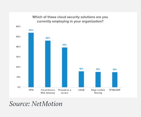 Согласно недавнему исследованию, VPN по-прежнему являются самой популярной технологией безопасности облачного доступа. Опрос NetMotion из 750 ИТ-руководителей. В 2020 году более 54% компаний использовали VPN для обеспечения безопасного удаленного доступа по сравнению с 15%, которые использовали решения ZTNA и SDP.