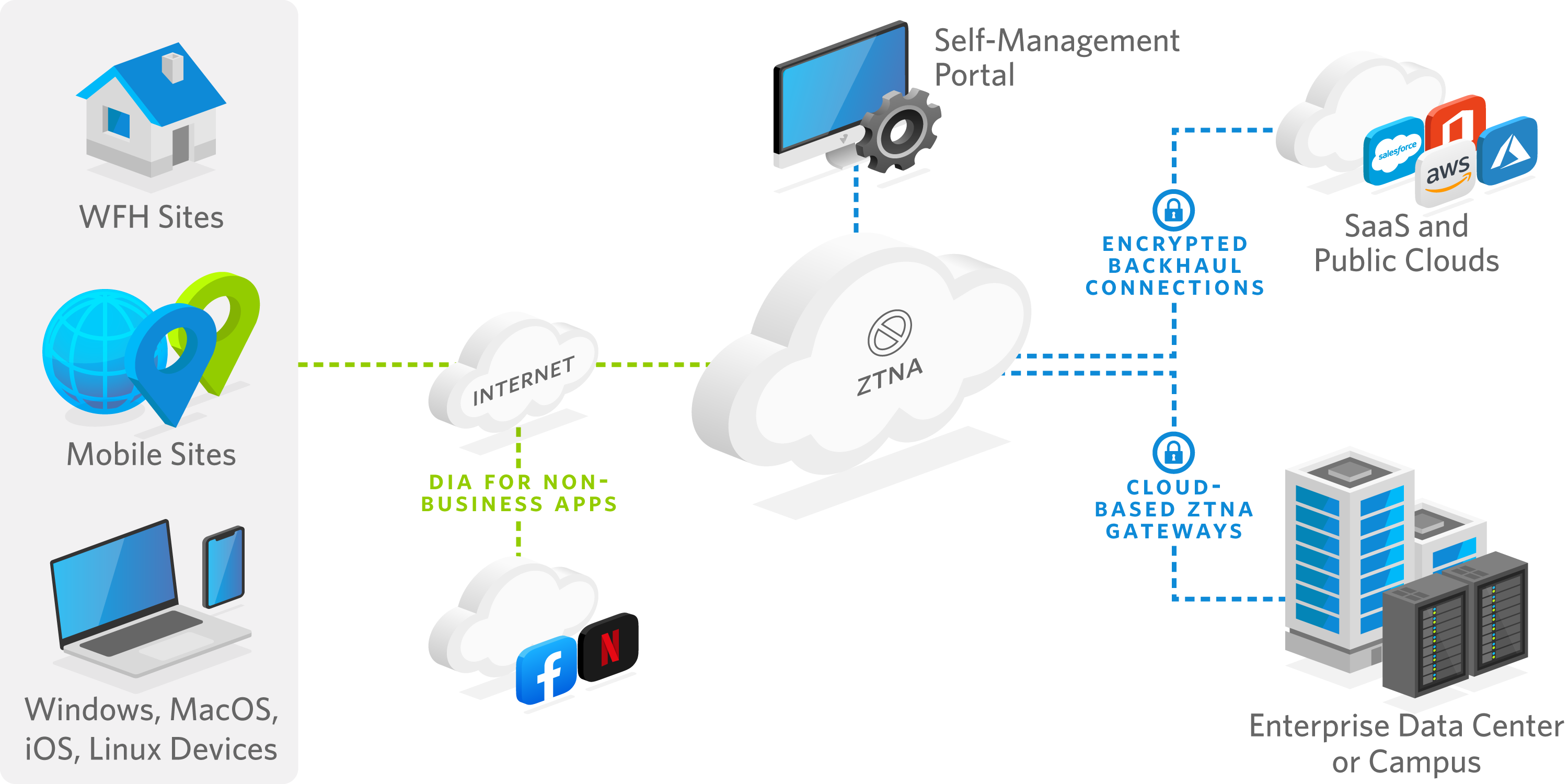 Развертывание ZTNA взаимодействует с существующими системами управления учетными данными пользователей / устройств и политиками безопасности, которые, возможно, уже интегрированы с вашей архитектурой SD-WAN.