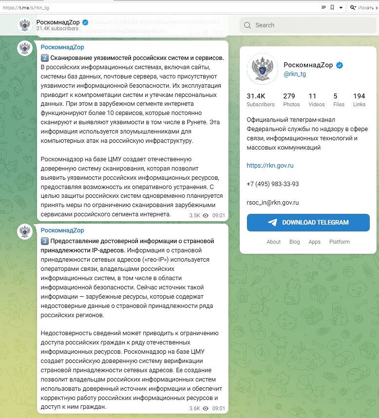 Роскомнадзор намерен ограничить доступ иностранным сканерам уязвимостей к российскому сегменту интернета, о чем написал в своем официальном Telegram-канале. Другими словами, он запретит им проверять Рунет на наличие в нем тех или иных уязвимостей, чтобы зарубежные хакеры не смогли воспользоваться полученной ими информацией. Это часть плана властей по «усилению безопасность информационной инфраструктуры России», которая на момент выхода материала состояла из трех крупномасштабных задач.