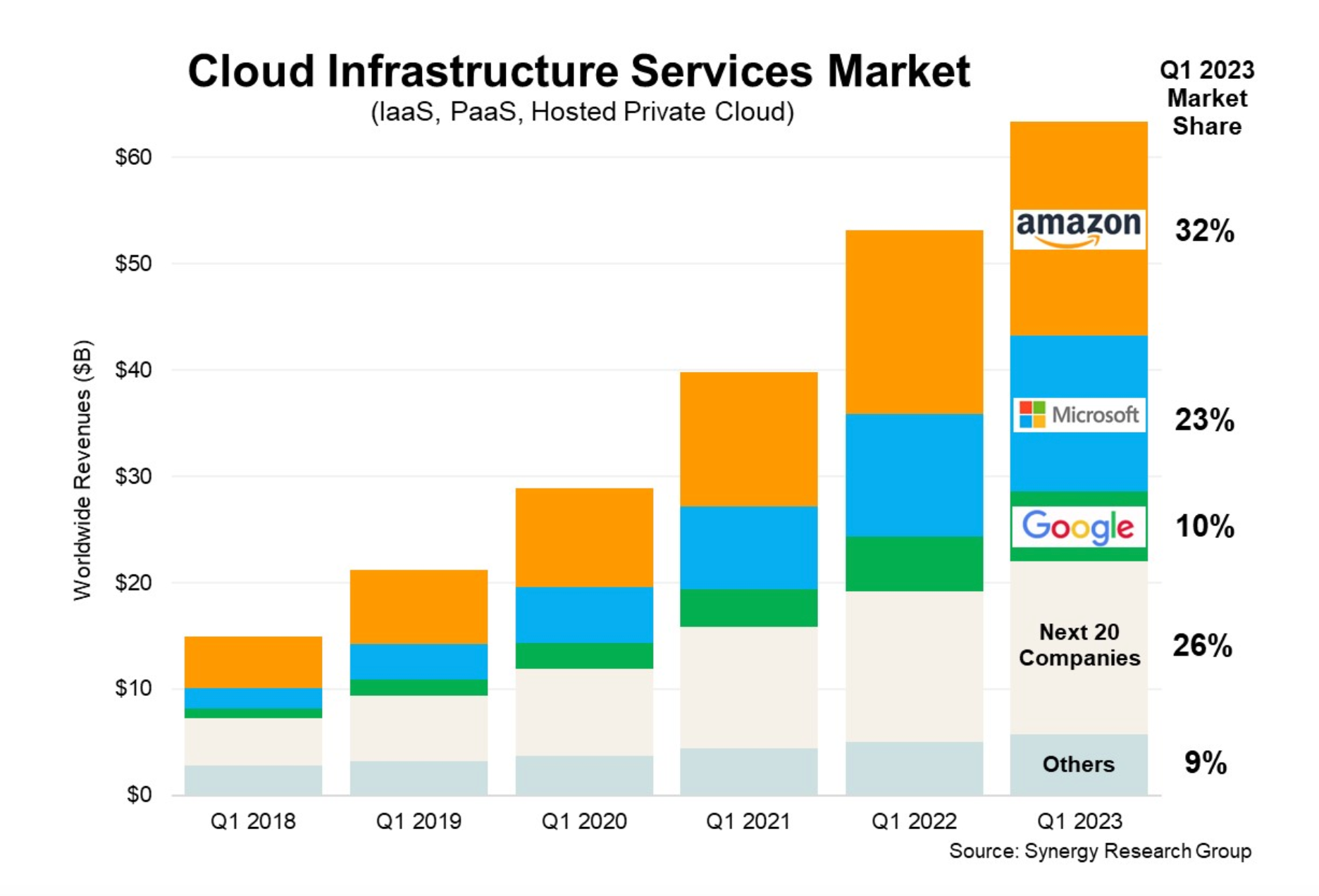 Недавний анализ Synergy Research Group, сравнивающий крупнейших поставщиков облачных услуг, показывает, что расходы предприятий на облачные решения достигли 63 миллиардов долларов по всему миру в первом квартале 2023 года, что на 20% больше, чем в том же квартале прошлого года.