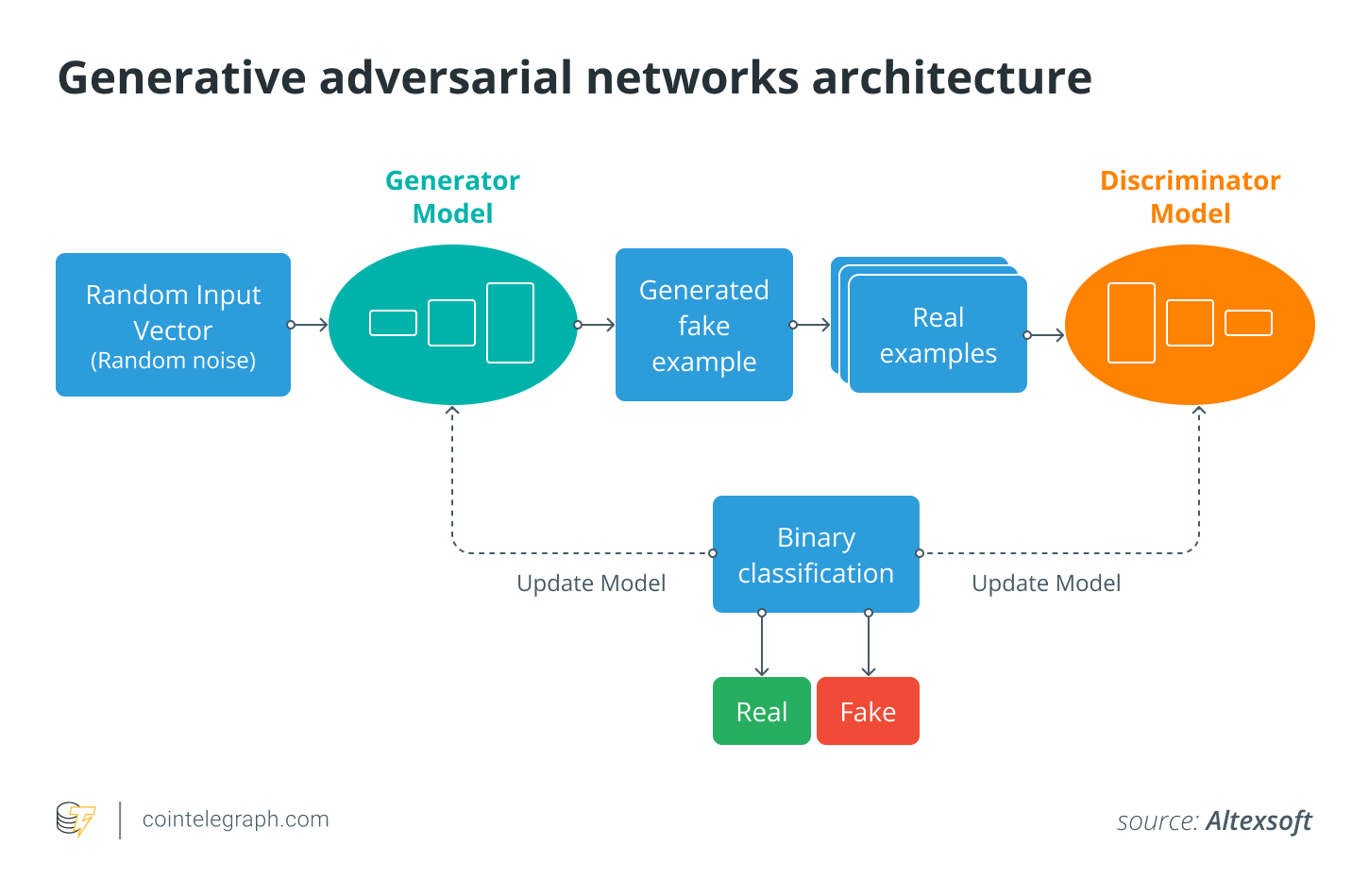 После обучения модель может создавать новый контент путем выборки из наблюдаемого распределения обучающего набора. Например, при создании фотографий модель может использовать случайный вектор шума в качестве входных данных для создания изображения, похожего на реальное животное.