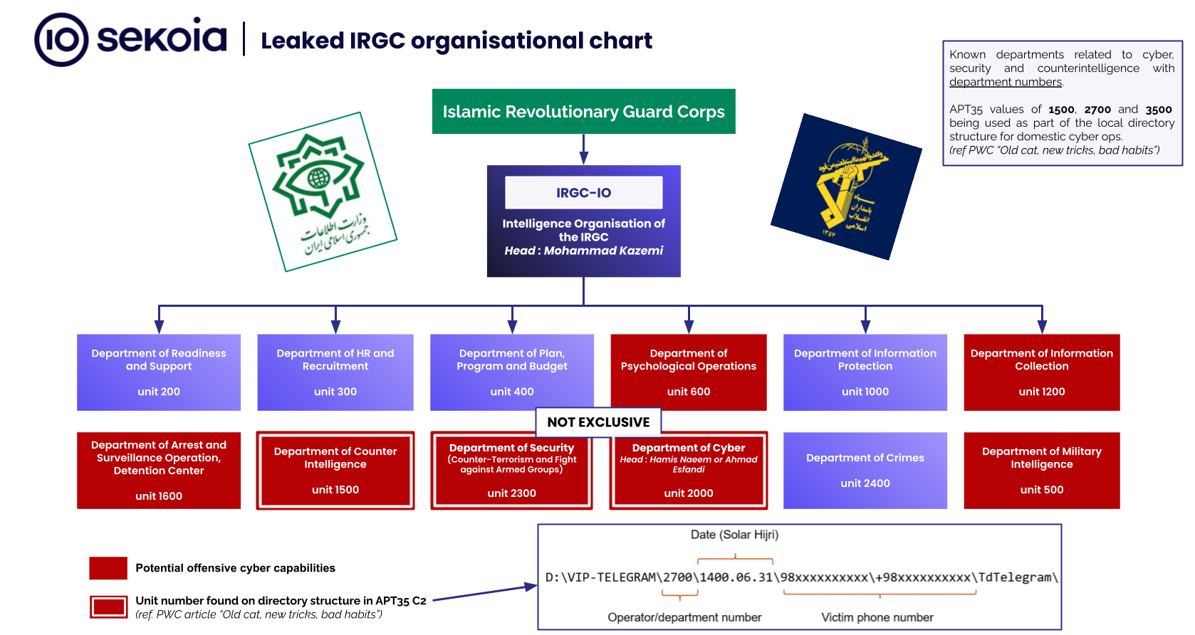 Иран представляет собой кибератаковый потенциал, которым в основном управляют две основные службы разведки и безопасности, Корпус стражей Исламской революции (IRCG) и Министерство разведки (MOIS).