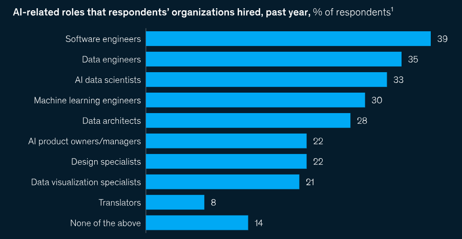 Инженеры-программисты вышли на первое место: 39% компаний заявили, что они были наняты на эту должность в связи с ИИ. Следующими стали инженеры по обработке данных и специалисты по обработке данных ИИ с 35% и 33% соответственно.