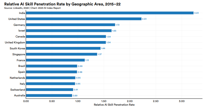 США не являются рынком с самым высоким уровнем проникновения навыков искусственного интеллекта.