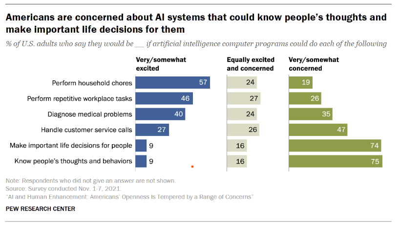 По данным исследовательского центра Pew Research Center, 57% американцев в восторге от того, что ИИ заменяет домашние дела. 40% говорят то же самое об ИИ, диагностирующем медицинские состояния, а 9% в восторге от того, что ИИ помогает им принимать важные жизненные решения.
