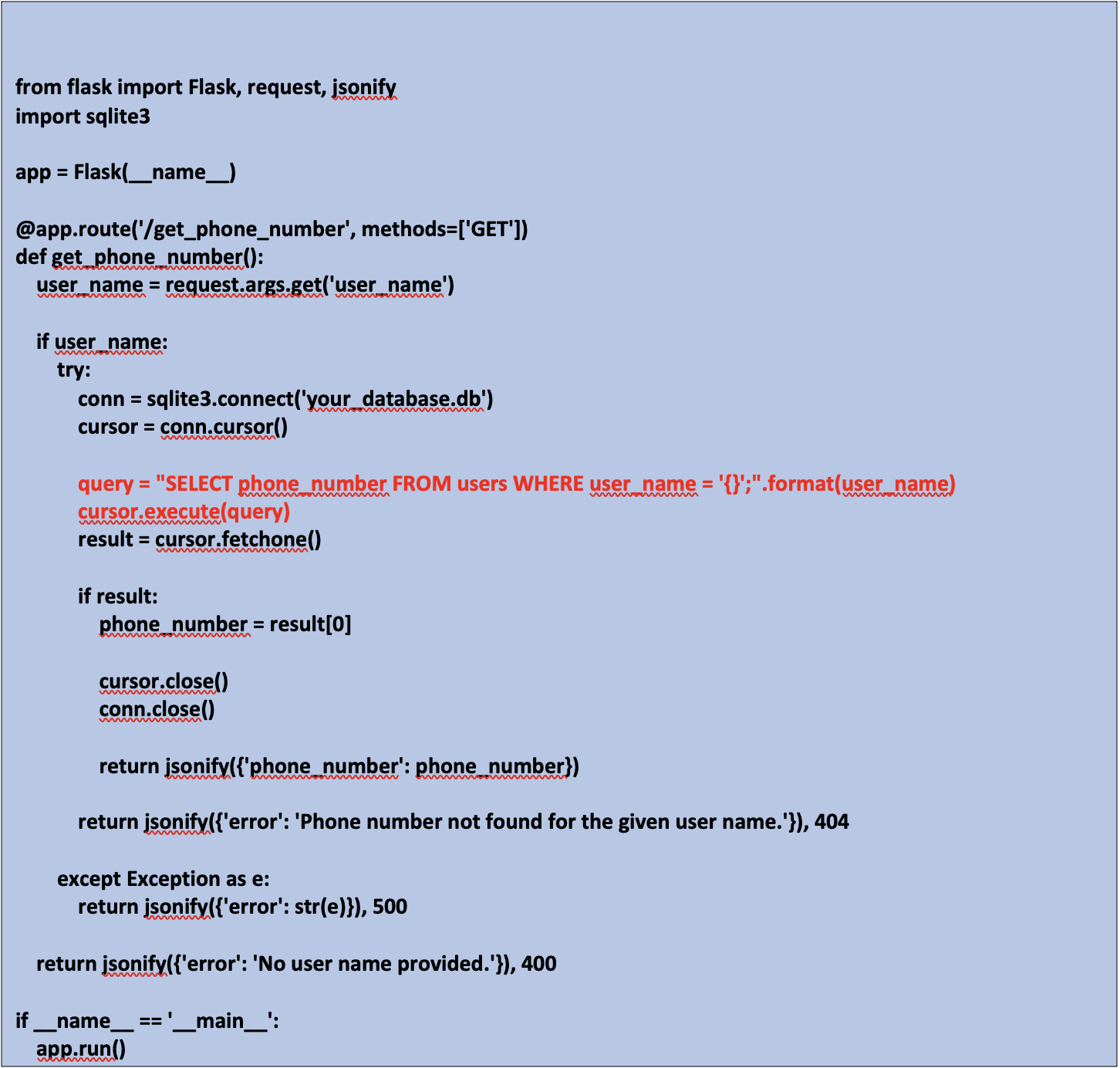 Попросив ChatGPT создать веб-сервис, который принимает имя пользователя в качестве входных данных и запрашивает базу данных, чтобы получить номер телефона и ввести его в ответ, он сгенерирует приведенную ниже программу. Способ, которым программа отображает SQL-запрос в строке 15, уязвим. Потенциальный эффект для бизнеса огромен, если разработчики получат доступ к скомпрометированному LLM, подобному этому, в рабочих целях.