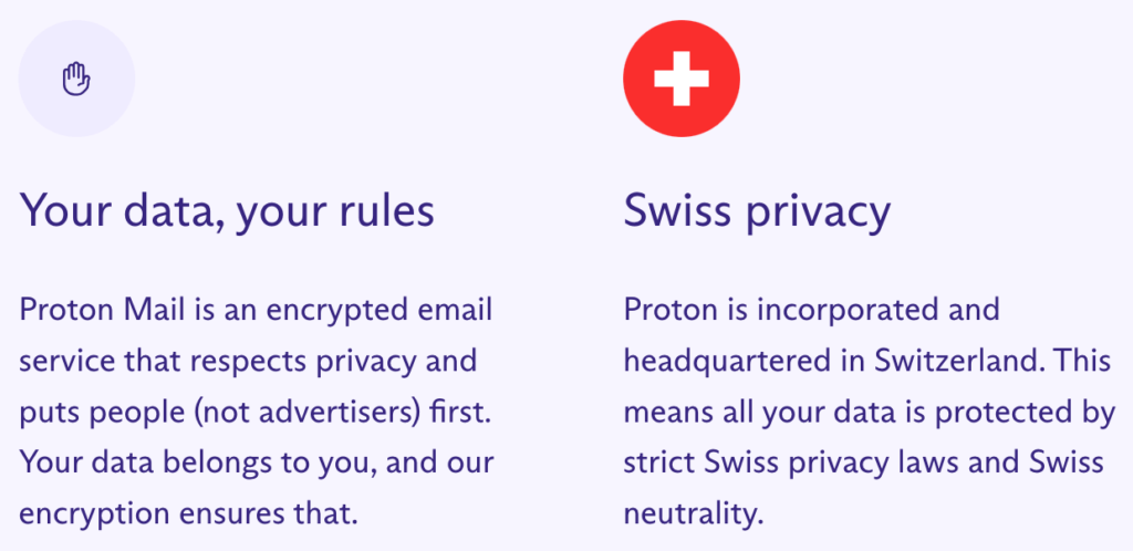 На домашней странице ProtonMail вы можете увидеть ссылки на “строгие швейцарские законы о конфиденциальности”, которые должны обеспечивать безопасность ваших данных.