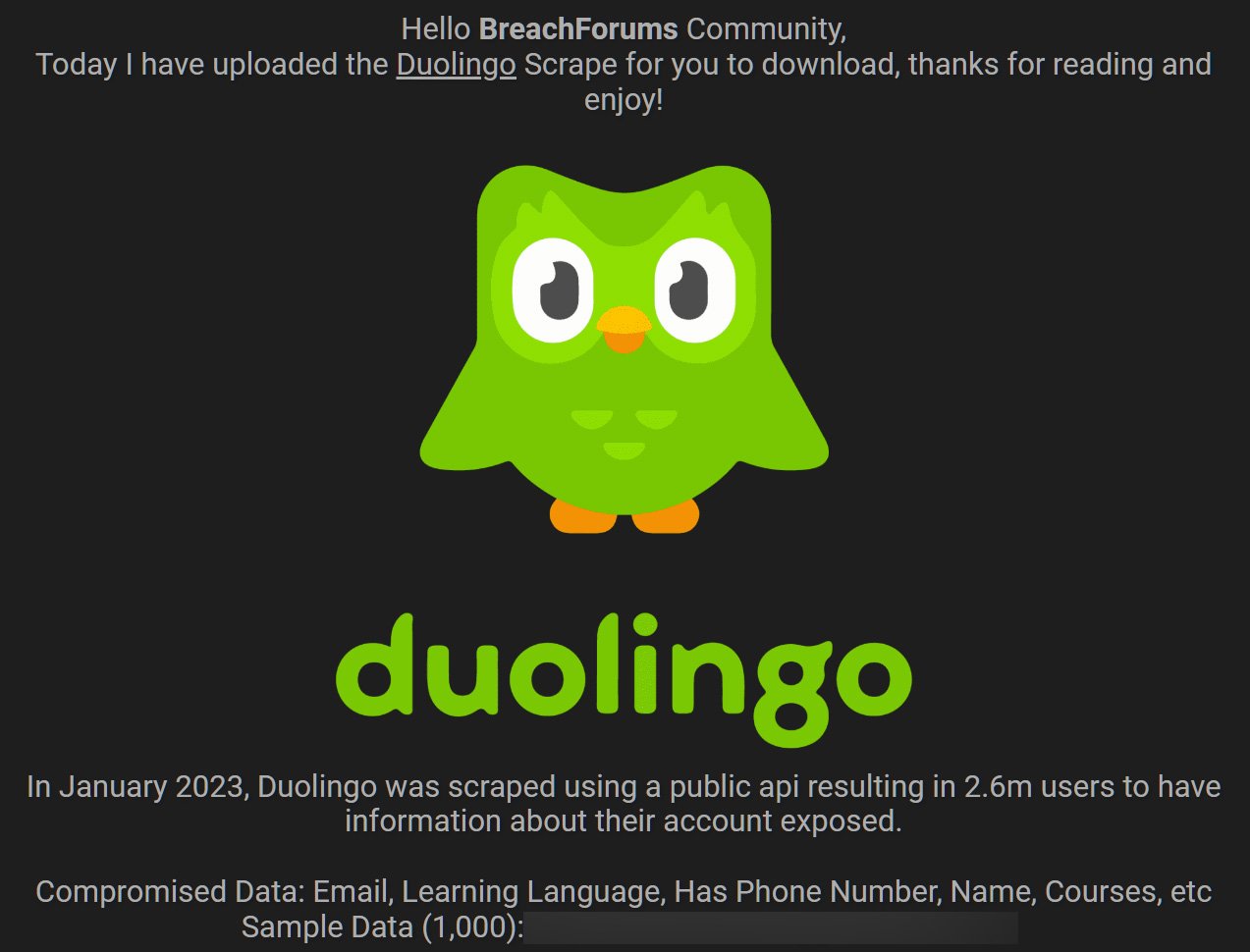 В январе 2023 года кто-то продавал удаленные данные 2,6 миллиона пользователей DuoLingo на закрытом хакерском форуме Breached за 1500 долларов.