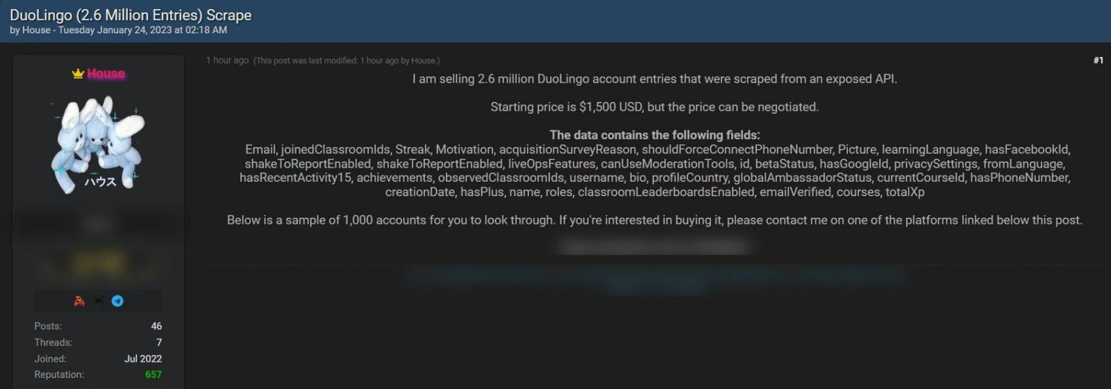 «Сегодня я загрузил Duolingo Scrape, чтобы вы могли скачать, спасибо за чтение и наслаждайтесь!», — говорится в сообщении на хакерском форуме.