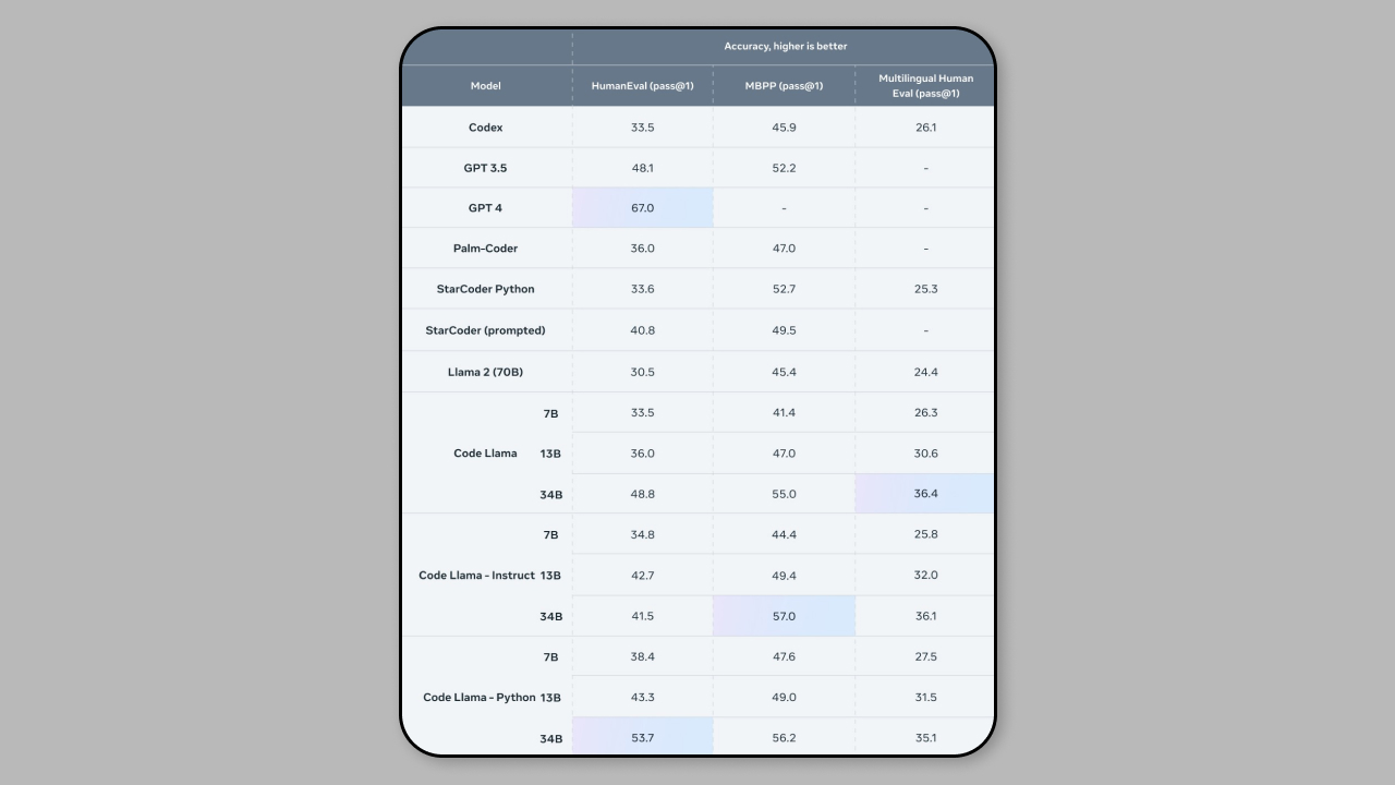 Code Llama также поставляется в трех размерах, с версиями параметров 7B и 13B, работающими с большей скоростью, или “низкой задержкой». Однако в нем говорится, что увеличенная версия с параметрами 34B обеспечит наилучшие результаты и окажет лучшую помощь при написании кода.