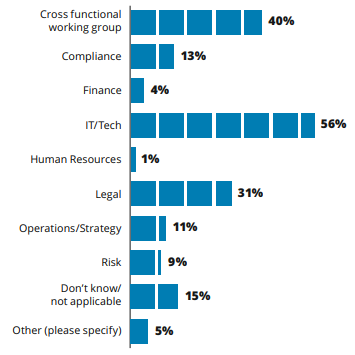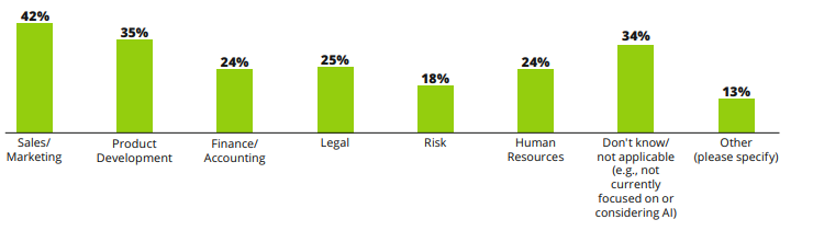 Наиболее распространенными ответами для крупных компаний были: продажи/маркетинг (55%), разработка продукции (48%) и юридические вопросы (42%). Для средних компаний: Не знаю/не применимо (48%), Продажи/Маркетинг (33%) и Разработка продукта (30%). Некоторые респонденты также указали такие области, как операционная деятельность, стратегические возможности, обслуживание клиентов, прогнозирование производства, нормативно-правовое регулирование/надзор, соблюдение нормативных требований и бэк-офисные функции.