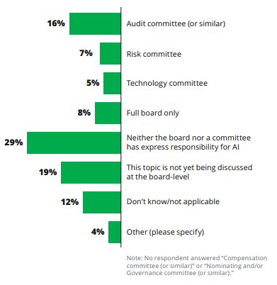 Наиболее часто встречающийся ответ о том, что ни совет директоров, ни комитет совета директоров не несет прямой ответственности за ИИ, был получен от 25% крупных и 38% средних компаний. За ним следуют ответы о том, что вопросы ИИ пока не обсуждаются на уровне совета директоров — 19% и 22% крупных и средних компаний, соответственно.
