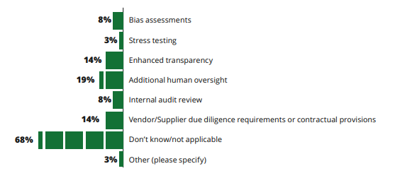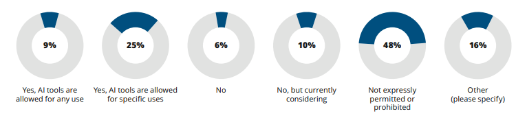 Почти половина (48%) всех респондентов из числа публичных компаний сообщили, что использование инструментов искусственного интеллекта не разрешено или запрещено в явном виде, однако этот показатель существенно различается в зависимости от размера рынка (25% крупных компаний и 63% средних компаний). Кроме того, 14% крупных компаний сообщили, что в настоящее время рассматривают вопрос о разрешении использования инструментов ИИ своими сотрудниками, в то время как среди средних компаний таких компаний оказалось 6%.