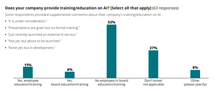 По мере того как компании продолжают изучать возможности ИИ и инвестировать в него, им также приходится учитывать многочисленные последствия для бизнеса, такие как этика, соблюдение нормативных требований и процессы регулирования; риски (например, операционные и репутационные) и склонность к риску; акционерный капитал; управление и роль совета директоров. В данной статье представлены результаты опроса членов Общества корпоративного управления, посвященного таким аспектам ИИ, как место ИИ в организации, политика/рамки использования, меры по снижению рисков, обучение и тренинги, а также надзор со стороны совета директоров.