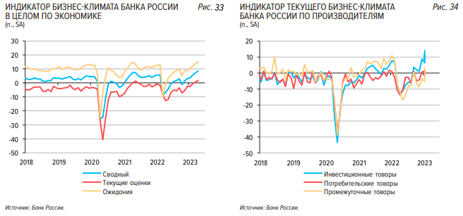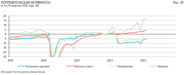 С одной стороны, даже в условиях целого ряда ограничений российская экономика продолжает развиваться. По информации из доклада о кредитно-денежной политике от 11 мая 2023 года Центрального банка России, индикаторы бизнес-климата демонстрируют рост. Наблюдается восстановление потребительской активности после спада в декабре прошлого года. Положительная динамика зафиксирована во всех крупных категориях: розничной торговле, платных услугах, общепите и других.