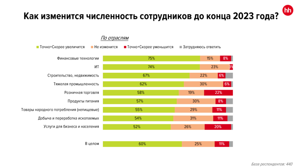 Ситуацию с зарплатной гонкой подтверждают и результаты другого опроса hh.ru. Чуть больше половины работодателей отметили — в течение 2023 года заработные платы в компаниях подрастут. Об увеличении численности сотрудников заявили 60% респондентов.