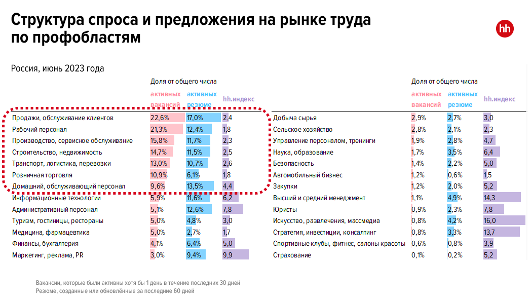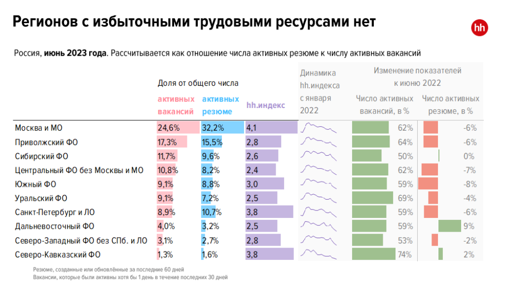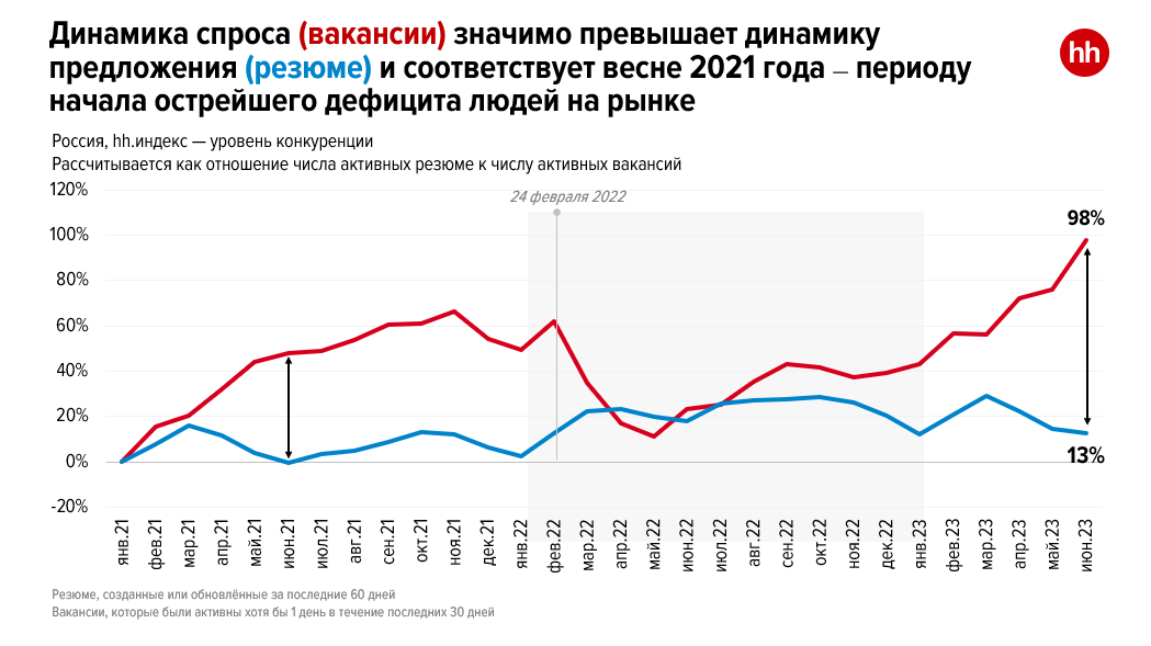 Уровень дефицита кадров можно определять по hh.индексу, он показывает соотношение числа активных резюме и открытых вакансий. Начиная с 2021 года минимальное значение было зафиксировано в июне 2021 года — 3,7 пункта. В мае 2023 года hh.индекс опустился до 3,6, в июне — до 3,1 пункта. Эксперты рынка труда прогнозируют, что ситуация может ухудшиться, поскольку лето не самое популярное время для смены и поиска работы.