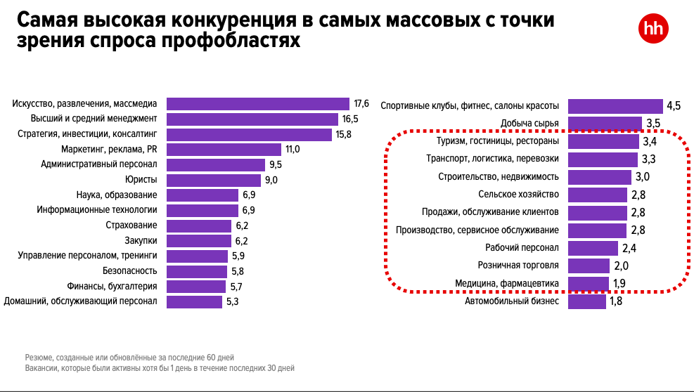 Как следствие, показатели hh.индекса очень разнятся в зависимости от профессиональной сферы. Например, число вакансий для топ-менеджеров, специалистов в области инвестиций, консалтинга, стратегического управления, а также для представителей сферы искусства, развлечений, массмедиа невелико, отсюда и высокий уровень конкуренции среди соискателей из этих профессиональных групп — от 15,8 до 17,6 пункта. И совсем другая картина наблюдается в медицине, фармацевтике, розничной торговле, производстве, а также по ролям синих воротничков, где спрос в разы превышает предложение.