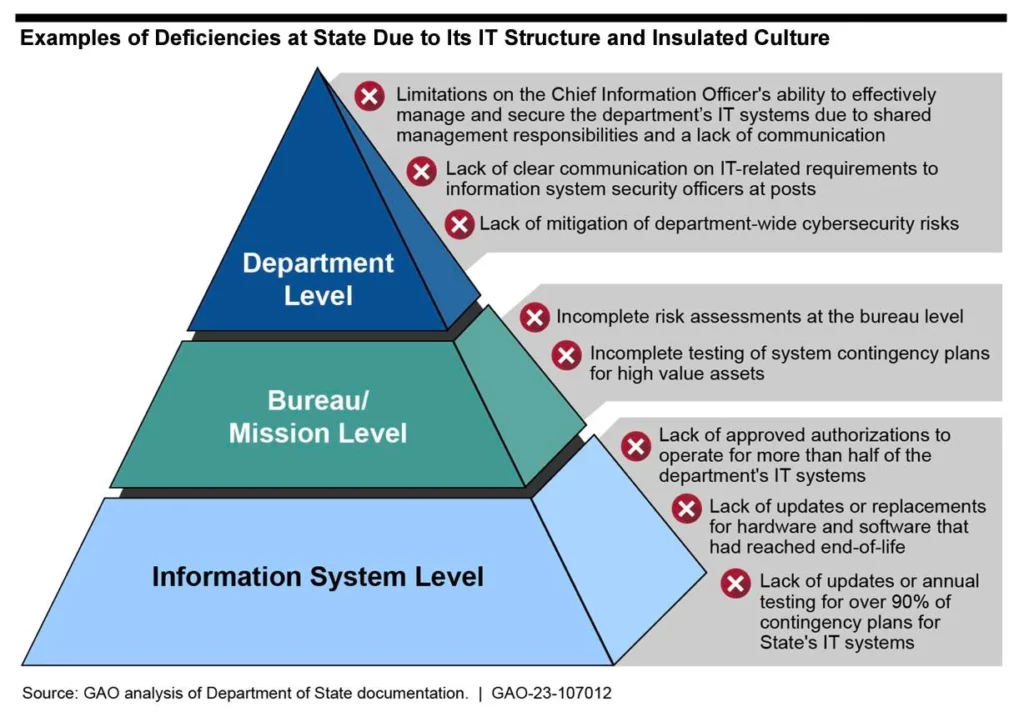 Значительная часть вины за неудачи в планировании кибербезопасности Госдепартамента ложится, по крайней мере, согласно GAO, на федеративную структуру штата, которая распределяет обязанности по управлению ИТ между ИТ-директором департамента и другими подразделениями. организации.
