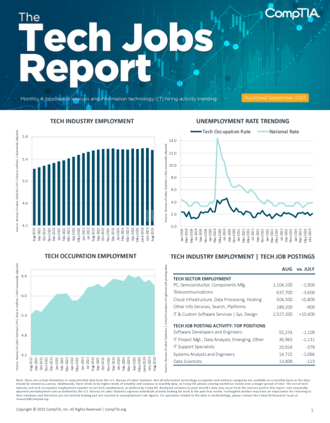 Согласно анализу CompTIA данных Бюро статистики труда США, компании технологического сектора сократили штат сотрудников на 2632 вакансии в прошлом месяце. Число рабочих мест в сфере технологий во всех секторах экономики сократилось примерно на 20 000.1 Уровень безработицы в сфере технологий, составляющий 2,2%, остается значительно ниже национального показателя в 3,8%.