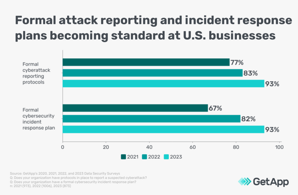Еще одним признаком того, что к безопасности относятся более серьезно, является неуклонно растущее число компаний, у которых есть официальные протоколы для сообщения о предполагаемой кибератаке, увеличившись с 77% в 2021 году до 83% в 2022 году, а теперь и до 94% в 2023 году.