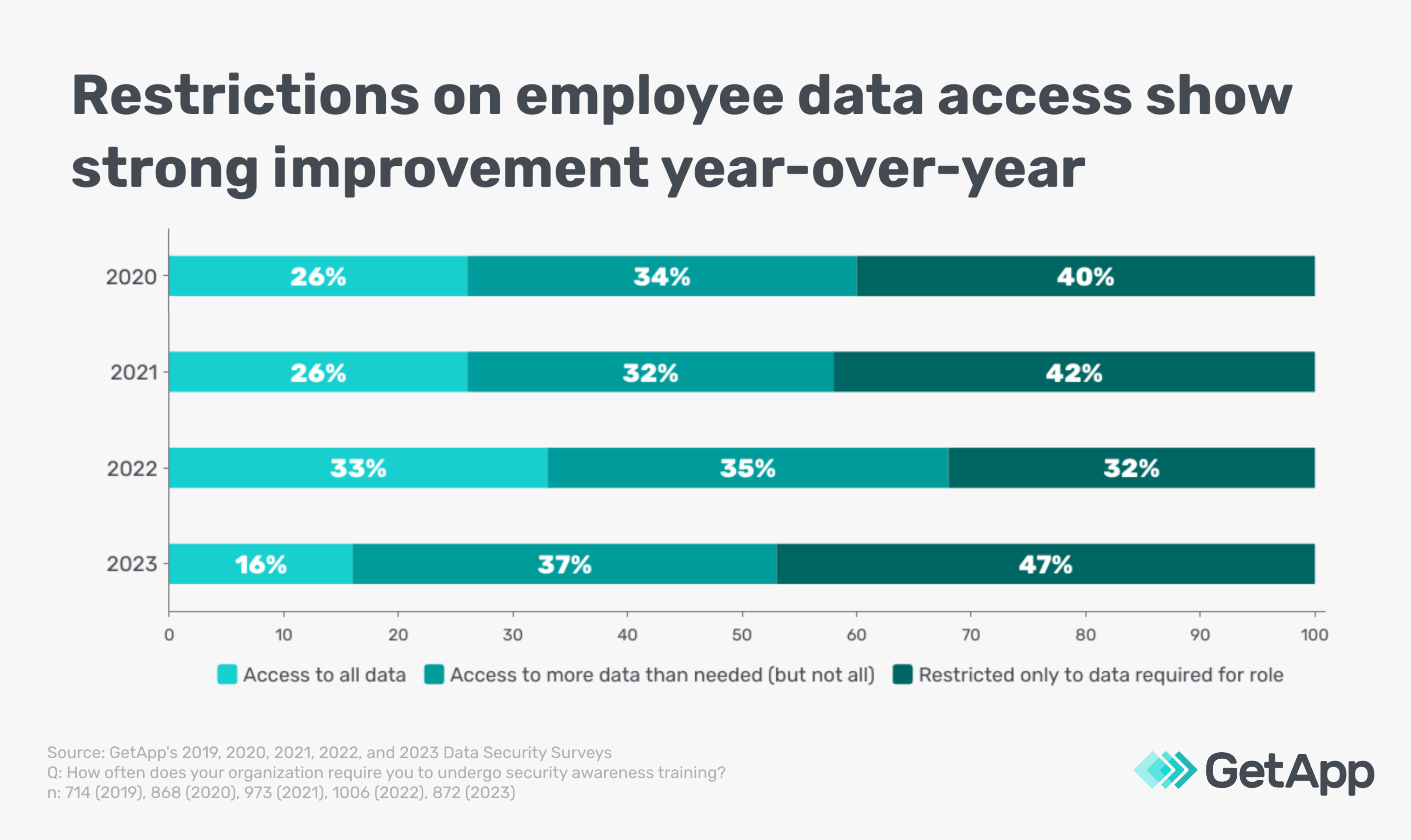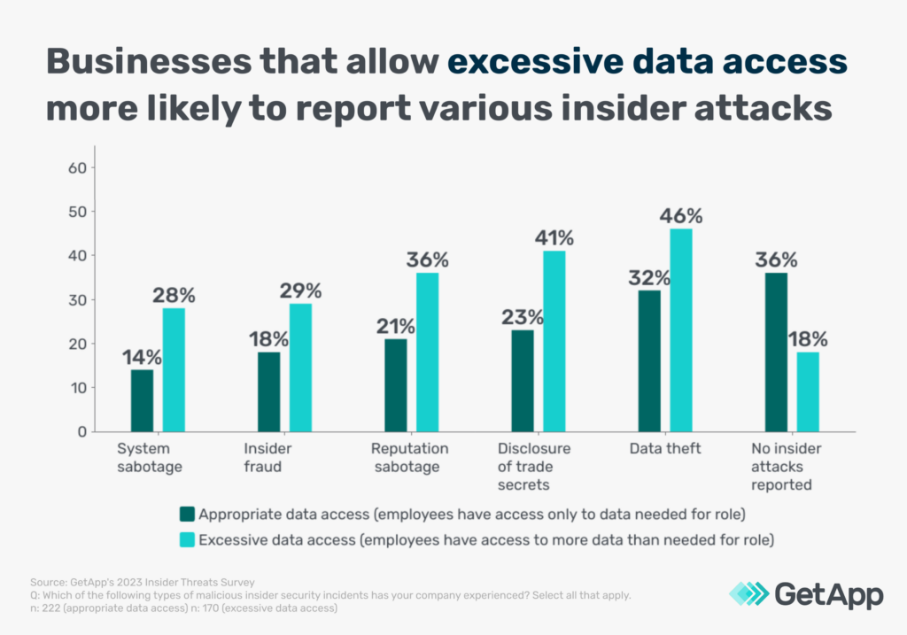 Чтобы проиллюстрировать разницу, которую это может иметь для безопасности вашей компании, результаты проведенного GetApp в 2023 году опроса по инсайдерским угрозам **** показывают резкие различия между компаниями, которые надлежащим образом ограничивают доступ к данным, и теми, которые допускают чрезмерный доступ к данным сотрудников (т. Е. больший доступ, чем требуется для роли). У компаний, которые ограничивают данные, в два раза больше шансов вообще избежать инсайдерских атак.
