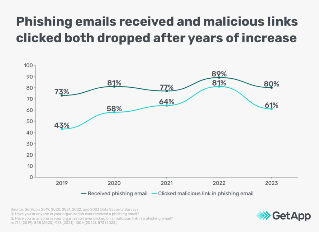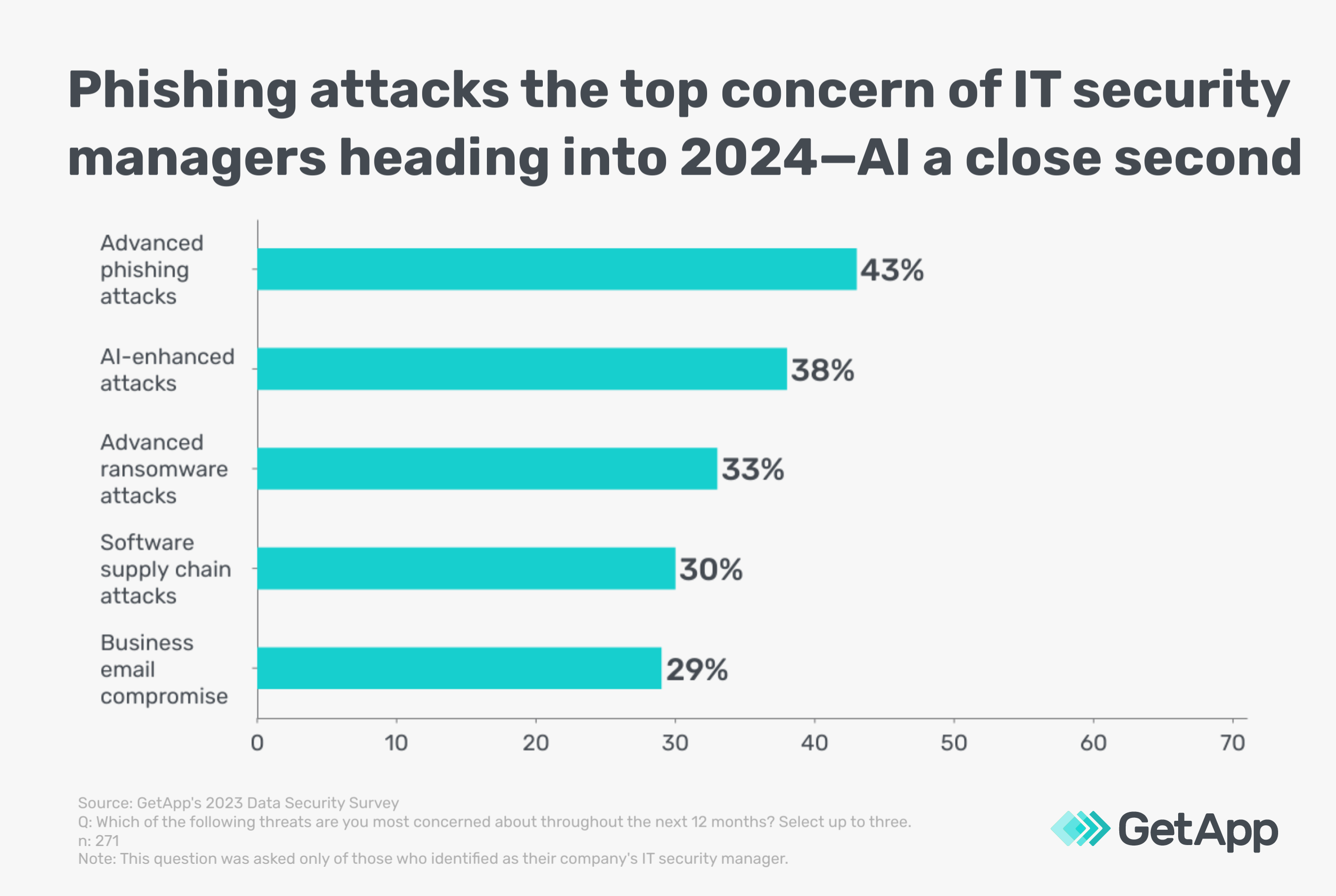 Хотя эти статистические данные улучшились по сравнению с поистине ужасными показателями 2022 года, они все еще довольно высоки, и фишинг остается главной угрозой для большинства предприятий. Еще раз повторяю, менеджеры по ИТ-безопасности считают продвинутые фишинговые атаки главной угрозой в 2024 году, поскольку схемы становятся все более целенаправленными, используют несколько платформ обмена сообщениями и используют искусственный интеллект для улучшения обмена сообщениями и распространения. Если вы ищете программное обеспечение для защиты электронной почты, которое поможет предотвратить фишинговые атаки, ознакомьтесь с нашими лидерами в категории безопасности электронной почты.