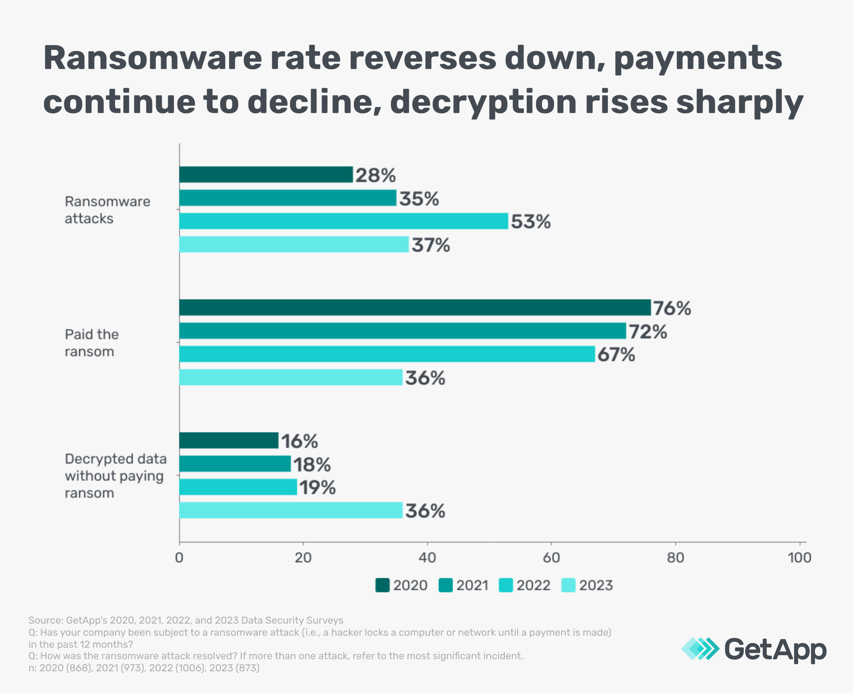 После нескольких лет увеличения объема и серьезности атак программ-вымогателей наткнулись на стену. Уровень программ-вымогателей, по-видимому, достиг максимума в 2022 году у 53% компаний и восстановился до 37%, ближе к уровню 2021 года (35%). Между тем, доля жертв, фактически выплачивающих выкуп, резко упала с 67% в прошлом году до всего 36% в этом году.
