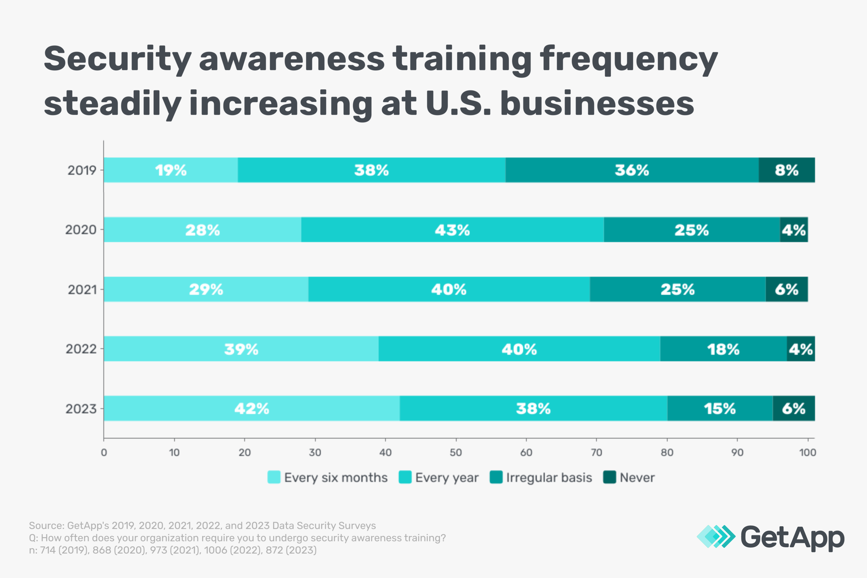 Число компаний, которые проводят обучение на нерегулярной основе, резко сократилось, сократившись с 36% в 2019 году до всего лишь 15% в 2023 году. Конечно, всегда найдется небольшая группа компаний, которые отказываются проводить какие-либо тренинги по безопасности, обычно около четырех-шести процентов.