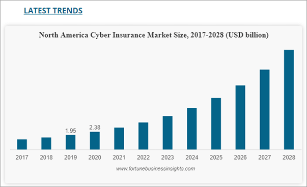 Тенденции рынка: Отчет о размере рынка киберстрахования от Fortune Business Insights показывает, что в 2020 году размер рынка составлял 6,15 млрд долларов, и, по прогнозам, он вырастет с 7,60 млрд долларов в 2021 году до 36,85 млрд долларов в 2028 году. (См. Изображение ниже). Текущий объем рынка 2022 года составляет 11,9 млрд долларов США.
