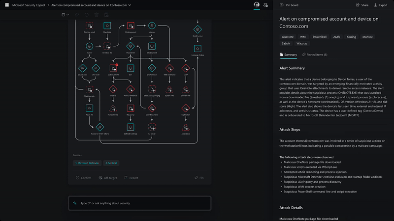 Пример работы Security Copilot с подробным ответом и советами по реагированию на ИБ-инцидент в корпоративной сети. ИИ обучен создавать слайды в PowerPoint для удобства действий с его советами далее.