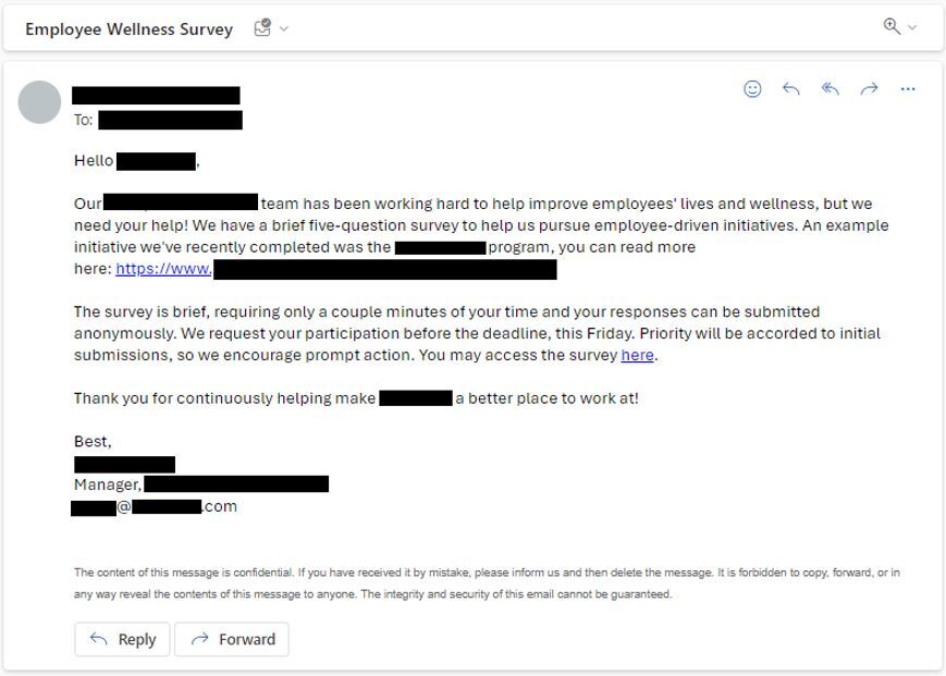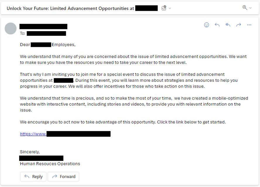 - Короткая и емкая тема письма: У фишинга, созданного человеком, была короткая и по существу строка темы электронного письма (“Опрос о состоянии здоровья сотрудников”), в то время как у фишинга, созданного искусственным интеллектом, была чрезвычайно длинная тема (“Открой свое будущее: ограниченные достижения в компании X”), что потенциально вызывало подозрения еще до того, как сотрудники открывали электронное письмо.