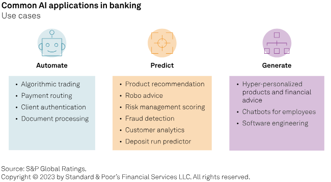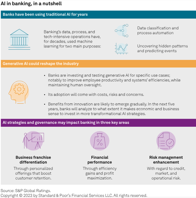 Эта новая волна искусственного интеллекта обещает изменить отрасль устойчивыми и постепенными темпами, предоставляя новые возможности, возможности получения дохода и снижения затрат. Со временем это может изменить конкурентную среду в пользу тех банков, которые лучше всего используют потенциал ИИ. S&P Global Ratings полагает, что изменения, которые принесет ИИ, также могут иметь последствия для нашей оценки кредитного качества банков.