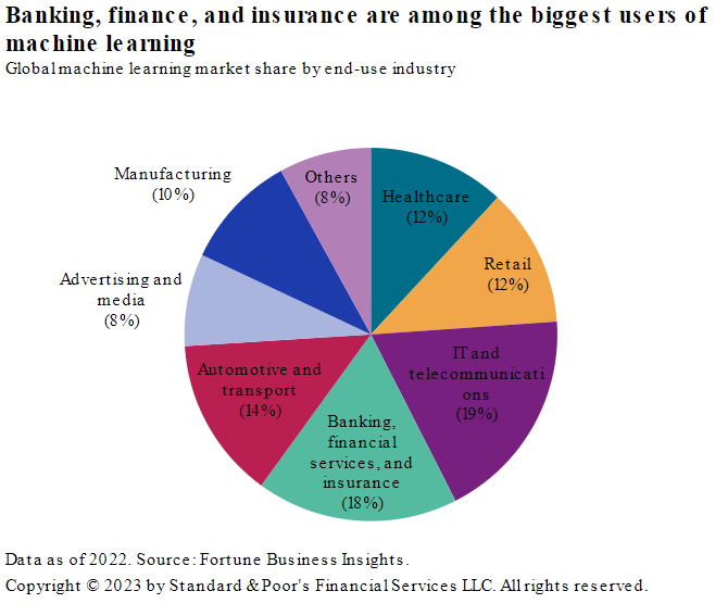Свидетельством преимуществ этого более раннего искусственного интеллекта является то, что (несмотря на его сложности) банки, поставщики финансовых услуг и страховой сектор стали одними из его наиболее активных пользователей. На конец 2022 года машинное обучение в банковской сфере, финансовых услугах и страховании составляло около 18% от общего объема рынка, по оценкам конечных пользователей (см. диаграмму 2).