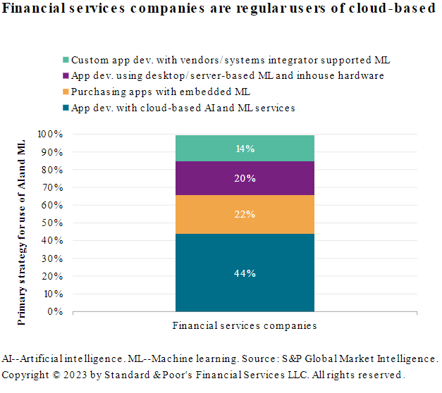 В своей стратегии ОД компании, предоставляющие финансовые услуги, похоже, в первую очередь полагаются на облачные сервисы машинного обучения, такие как AWS, Microsoft Azure или Google ML (см. диаграмму 3). Более того, большинство (71%) по-прежнему используют частные облачные среды, а не общедоступное облако, согласно исследованию, проведенному исследовательским подразделением TMT S & P Global Market Intelligence, подразделения S & P Global.