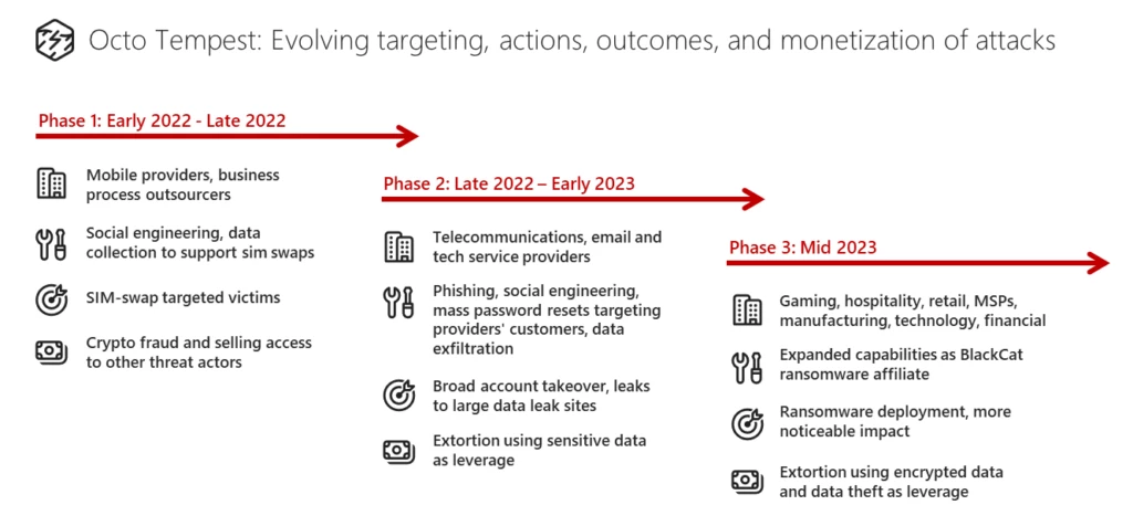 Octo Tempest — финансово мотивированный коллектив носителей англоязычных угроз, известных запуском широкомасштабных кампаний, в которых широко используются методы поиска противника посередине (AiTM), социальная инженерия и возможности обмена SIM-картами. Octo Tempest, который пересекается с исследованиями, связанными с 0ktapus, Scattered Spider и UNC3944, первоначально был замечен в начале 2022 года и предназначался для организаций мобильной связи и аутсорсинга бизнес-процессов для инициирования переноса телефонных номеров (также известного как замена SIM-карт). Octo Tempest монетизировала свои вторжения в 2022 году, продавая другим преступникам обмен SIM-картами и осуществляя захват аккаунтов состоятельных людей с целью кражи их криптовалюты.