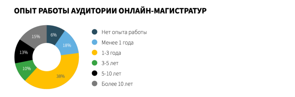Многие идут в магистратуру сразу после бакалавриата, поэтому имеют небольшой стаж: 18% работают менее года, 38% от 1 до 3 лет. Но есть и более опытные специалисты: у 10% стаж от 3-х до 5 лет, у 13% — 5–10 лет, а у 15% — более 10 лет.