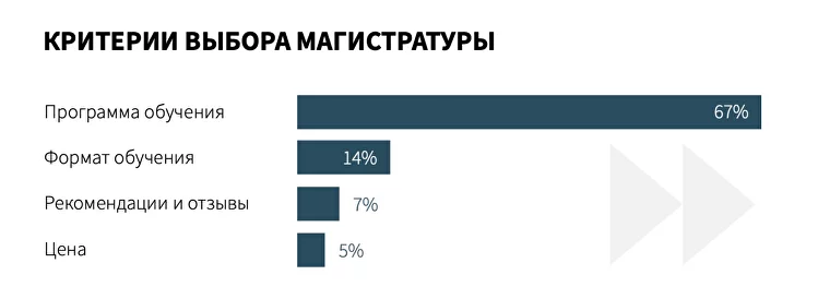 При выборе магистратуры абитуриенты смотрят на несколько факторов. Главным критерием для большинства из них является программа обучения — она важна 67%. На втором месте (14%) — формат обучения. Также, поступающие учитывают рекомендации и отзывы (7%) и стоимость обучения (5%).