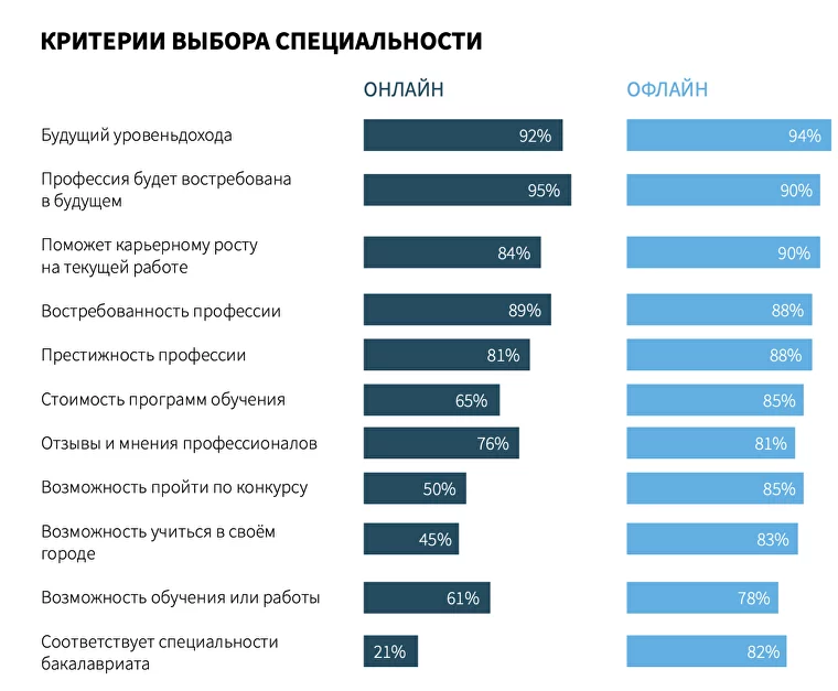 Исследование O+K Research это подтверждает. При выборе вуза поступающие на онлайн-магистратуры смотрят именно на программу обучения, а офлайн-абитуриентам одинаково важны и другие критерии, такие как престижность вуза, его оснащенность, предоставляемые возможности, стоимость и местоположение.