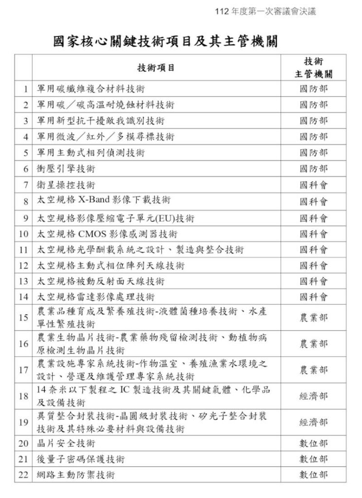 Национальный совет Тайваня по науке и технологиям недавно выпустил перечень из 22-х ключевых технологий, охватывающих пять стратегически важных сфер: оборону, сельское хозяйство, полупроводниковую отрасль, космические исследования и кибербезопасность ARES. В области полупроводников список включает передовые методы производства интегральных схем, использующих процессы с критическим размером менее 14 нанометров, а также сопутствующие важные технологии, включая специальные газы, химические вещества и оборудование.