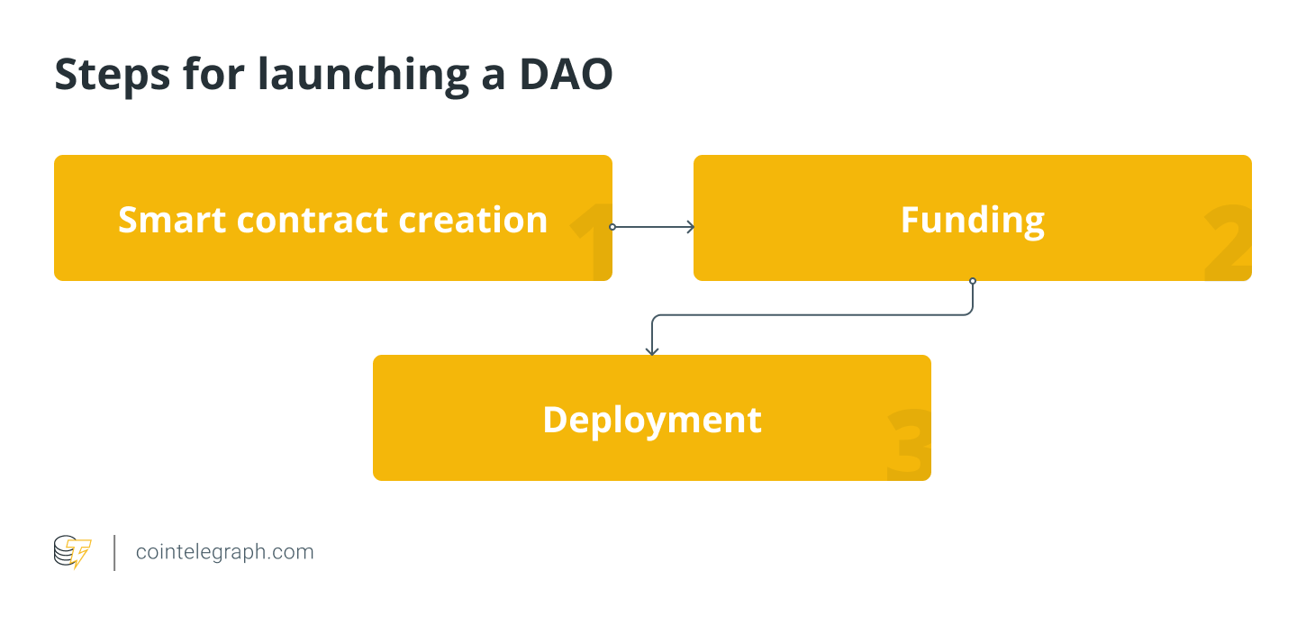 Развертывание: Как только все настроено, DAO необходимо развернуть на блокчейне. С этого момента заинтересованные стороны принимают решение о будущем организации. Создатели организации — те, кто написал смарт-контракты, — больше не влияют на проект больше, чем другие заинтересованные стороны.