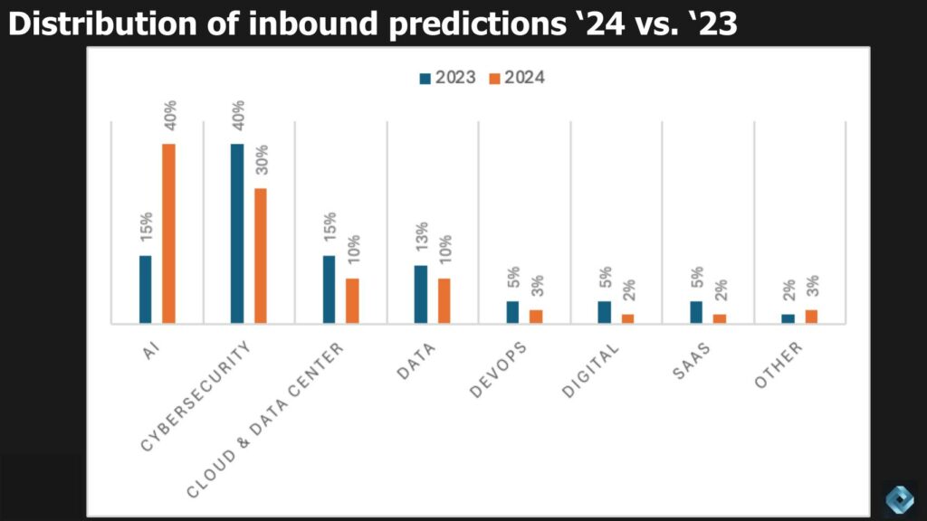 Неудивительно видеть огромный скачок в прогнозах искусственного интеллекта, которые частично занижены, потому что практически все эти категории включали некоторый контент с искусственным интеллектом. Кибербезопасность снижается, но по-прежнему заметна, за ней следуют облака, центры обработки данных и данные / аналитика. Затем немного DevOps, digital, software as a service и некоторые другие лакомые кусочки.