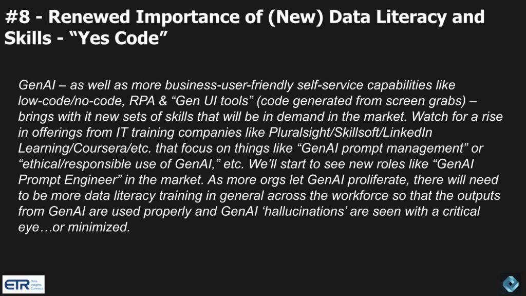 Искусственный интеллект нового поколения, а также более удобные для бизнеса возможности самообслуживания, такие как low–code / no-code, RPA и “инструменты пользовательского интерфейса поколения” (код, генерируемый на основе снимков экрана), приносят с собой новые наборы навыков, которые будут востребованы на рынке. Следите за ростом предложений от компаний, занимающихся обучением ИТ, таких как Pluralsight, Skillsoft, LinkedIn Learning, Coursera и других, которые фокусируются на таких вещах, как оперативное управление с помощью gen AI” или “этичное / ответственное использование gen AI”. Мы начнем видеть на рынке новые должности, такие как “оперативный инженер с помощью gen AI”. По мере того, как все больше организаций способствуют распространению ИИ нового поколения, необходимо будет проводить больше обучения информационной грамотности в целом среди сотрудников, чтобы результаты ИИ нового поколения использовались должным образом, а «галлюцинации” нового поколения ИИ рассматривались критически … или сводились к минимуму.