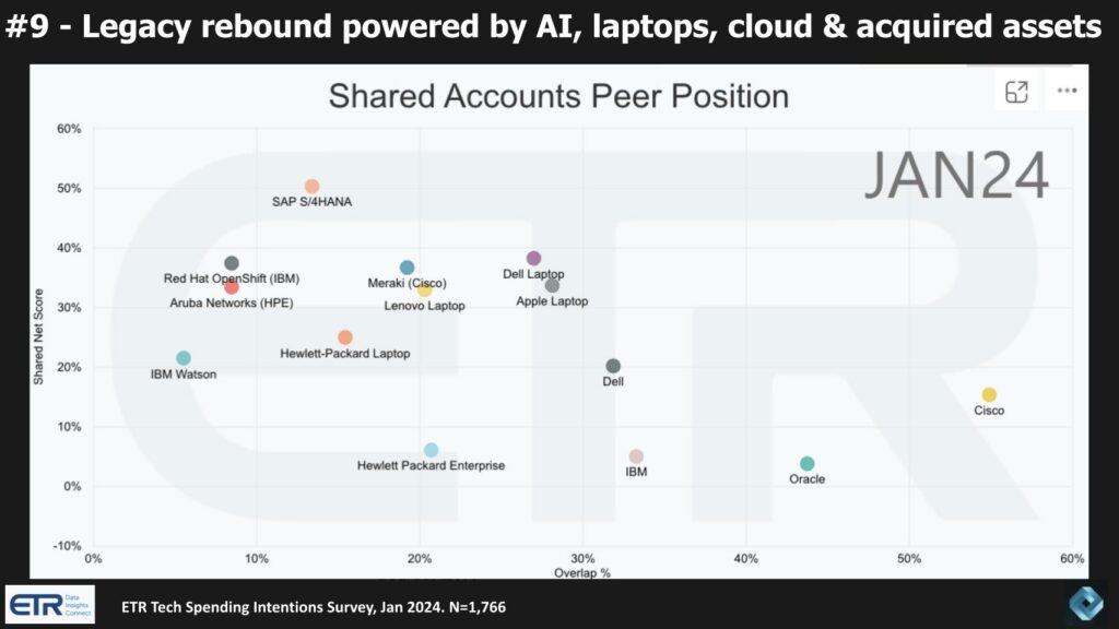 Подводя итог, наш анализ показывает, что компании-наследники переживают значительное возвращение, чему способствуют искусственный интеллект, облачные инновации и акцент на аппаратном обеспечении. Это возрождение — не просто возвращение к форме, но эволюция, поскольку эти компании активно внедряют новые технологии и динамику рынка. В результате они имеют хорошие возможности для конкуренции в текущем технологическом ландшафте, что делает их еще более конкурентоспособными в этом десятилетии в борьбе с доминирующими игроками, работающими в облачной среде.