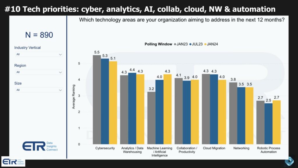- Недавнее исследование ETR в области искусственного интеллекта показывает разделение 50 на 50 между людьми, заявляющими, что они собираются разрабатывать свои собственные решения в области искусственного интеллекта с использованием открытого исходного кода, будь то Anthropic или OpenAI и тому подобное, а остальные 50% все еще надеются, что это внедрится в их уже проверенных поставщиков. У этих поставщиков есть окно, но оно не такое большое. Им нужно начать расширять свои возможности и сообщать о своих планах развития искусственного интеллекта, если мы хотим, чтобы эта тенденция приобрела форму.