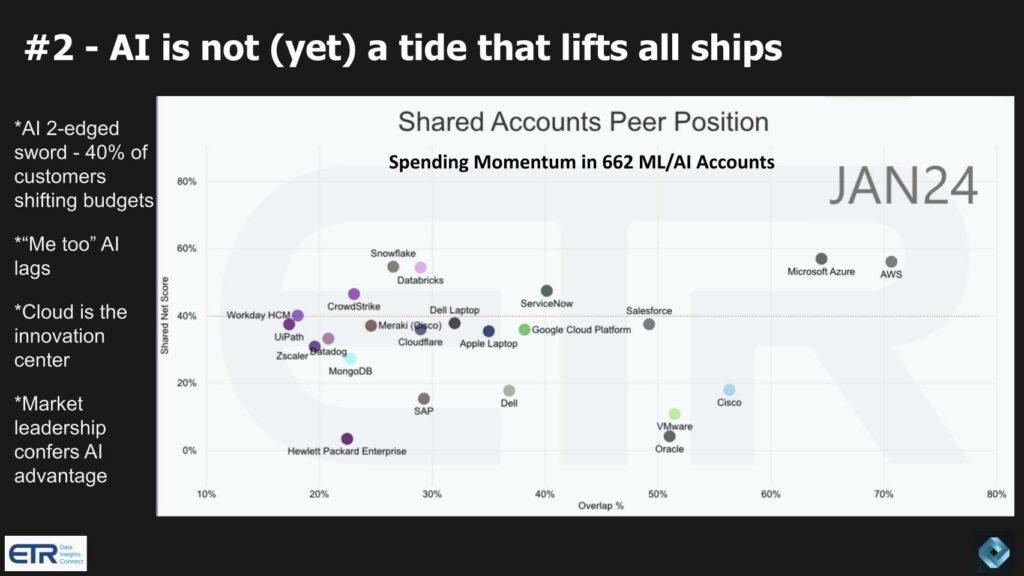 Искусственный интеллект, на наш взгляд, — это палка о двух концах. В некоторых случаях это может быть попутный ветер. Компании, работающие с искусственным интеллектом, такие как OpenAI, Anthropic PBC, Hugging Face Inc. и некоторые другие, очевидно, извлекают выгоду из этой тенденции. Примечательно, что поставщики общедоступных облаков и даже специализированных облаков искусственного интеллекта, таких как CoreWeave Inc., Core42, Lambda Inc. и Genesis Cloud GmbH, безусловно, выигрывают от повышения mindshare. Однако 40% клиентов говорят, что их средства на искусственный интеллект поступают из других бюджетов.