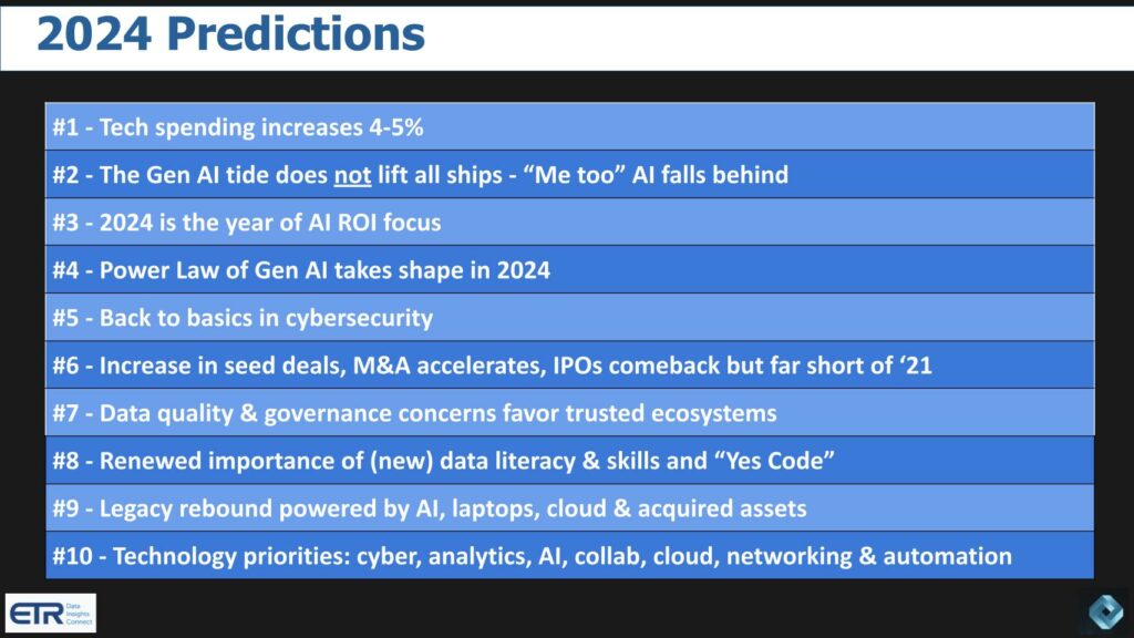Суть этого прогноза в том, что мы прогнозируем два возможных результата: 1) рентабельность инвестиций ИИ очевидна и способствует увеличению общих расходов на технологии; или 2) ИИ не оправдывает своих ожиданий на 2024 год, и расходы на технологии остаются незначительными. Наш базовый сценарий заключается в том, что AI ROI не обеспечит достаточного свободного денежного потока в 2024 году для обеспечения финансирования по принципу “gainshare”, которое увеличивает общие расходы на ИТ сверх ожидаемого среднего уровня.